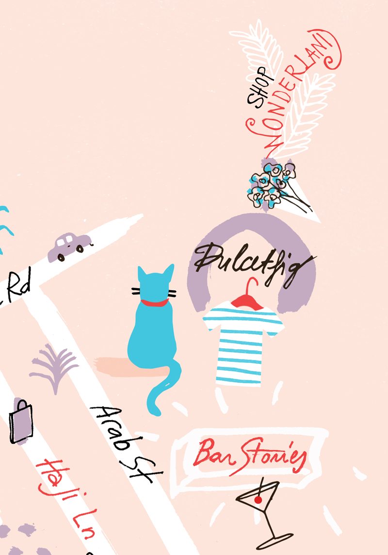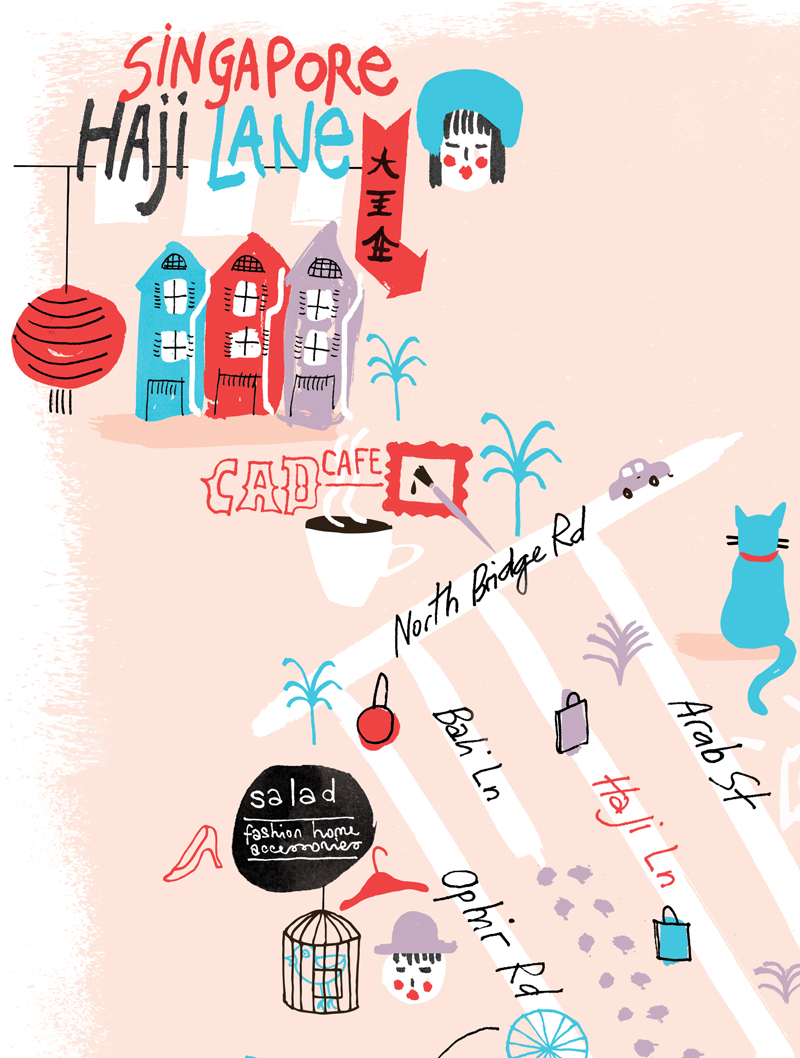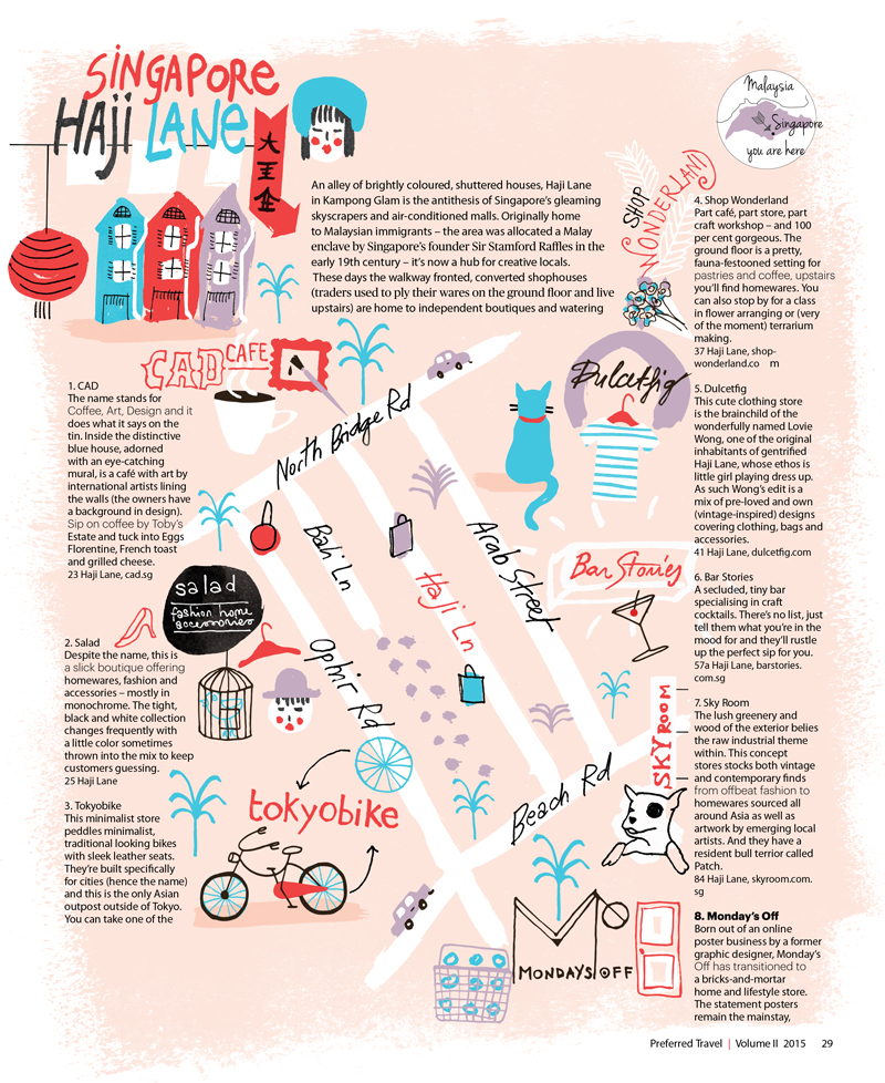Illustration for Preferred Hotel Travel Magazine on paper: a map of Haji Lane hot spots in Singapore.